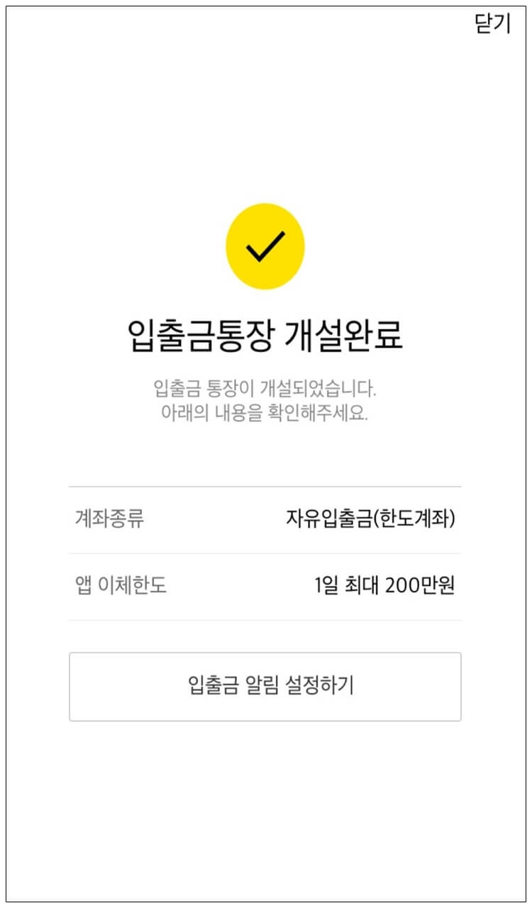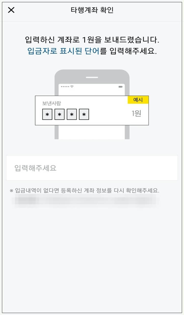 신분증 확인이 진행된 후, 추가로 본인확인 마지막 단계가 진행 > 계좌 개설자 명의의 타 은행으로 1원이 입금되며, 입금된 입금자 단오를 입력하면 최종 입출금통장 계좌 개설 완료.