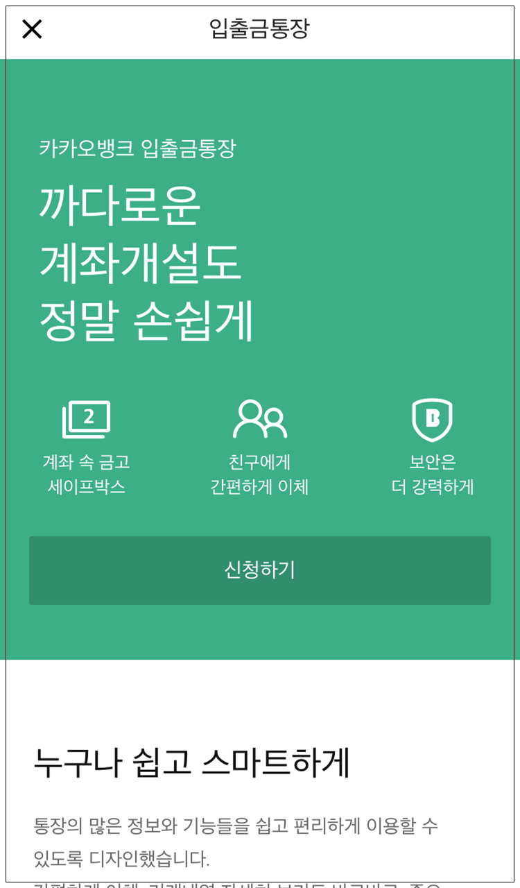 약관동의 > '+계좌 개설하기' 클릭 > 카카오 뱅크 입출금통장 '신청하기' 클릭합니다.