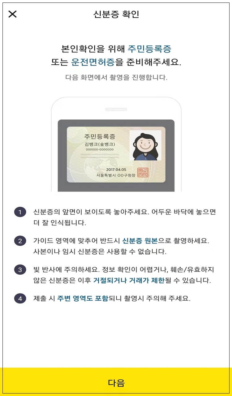 은행에서 본인의 신분을 확인하기 위해 신분증이 필요한 것 처럼, 카카오뱅크도 계좌를 개설하기 위해서는 본인 신분증(주민등록증 또는 운전면허증)을 준비하셔야 합니다.