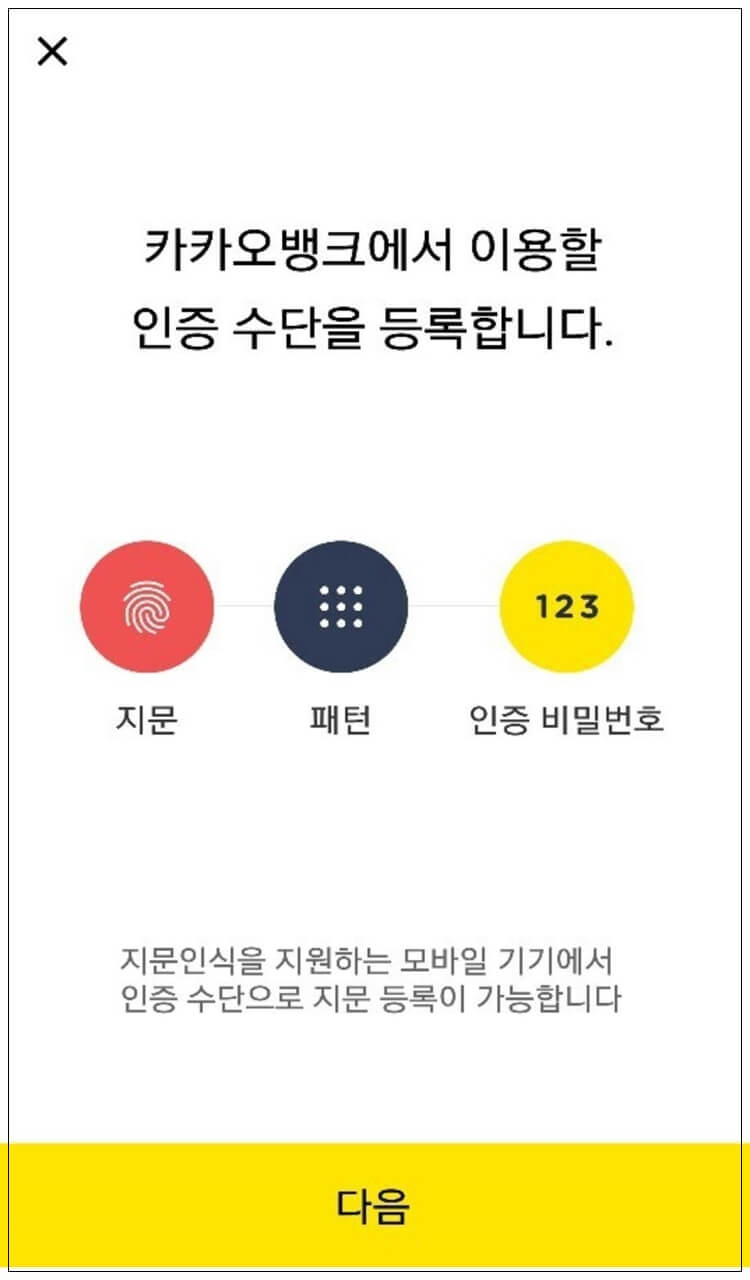 실명정보 확인을 위한 성명과 주민번호 입력 > 휴대폰 본인확인 > 카카오 뱅크에서 이용할 인증수단 등록.