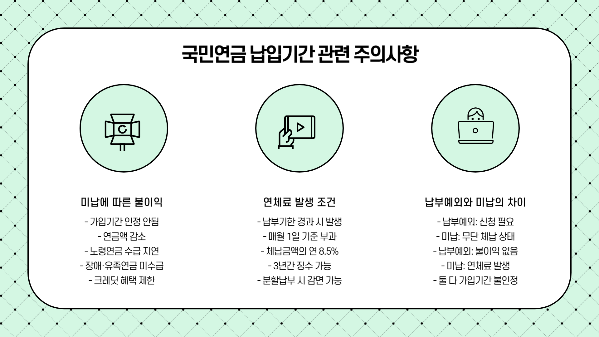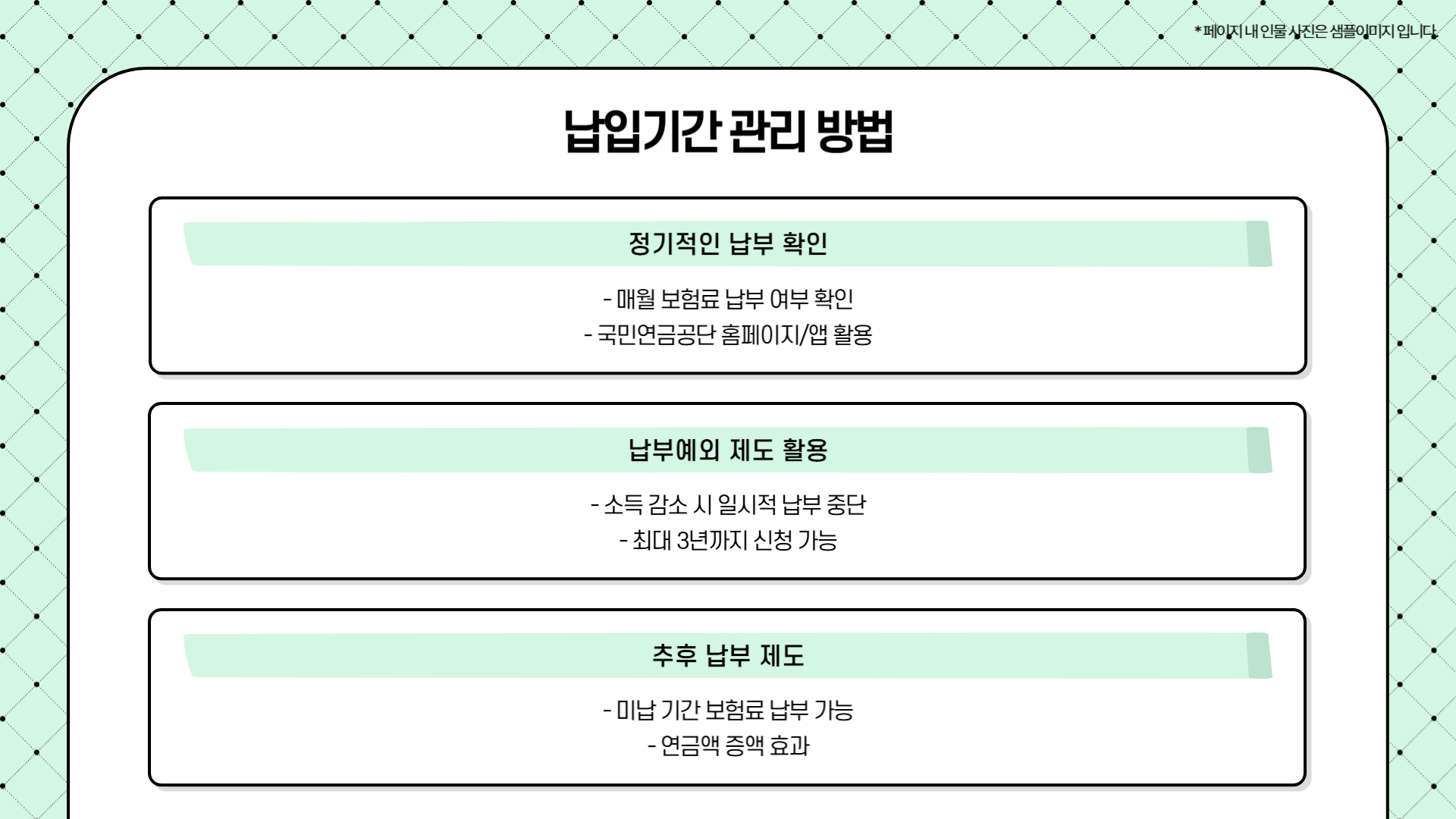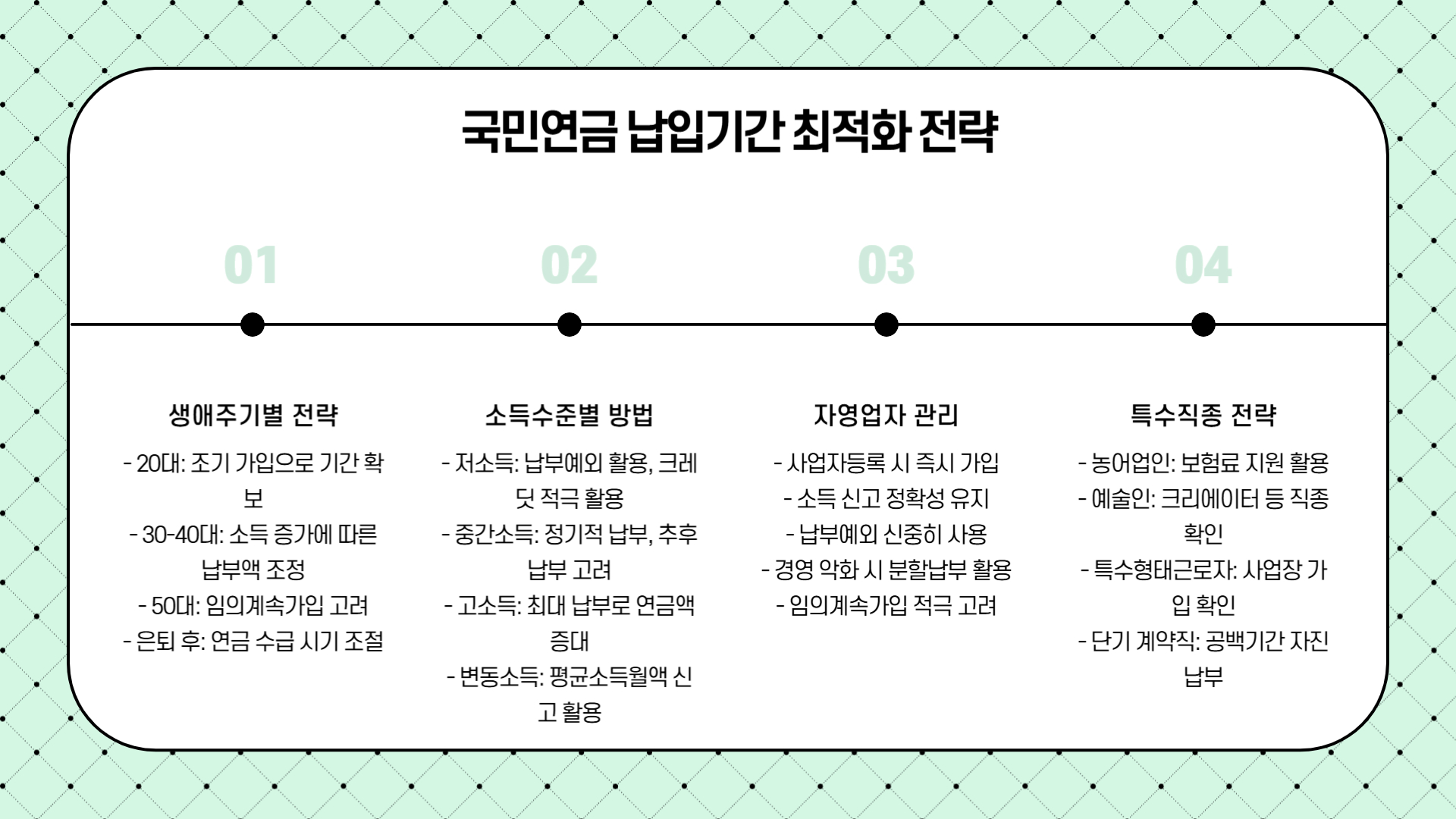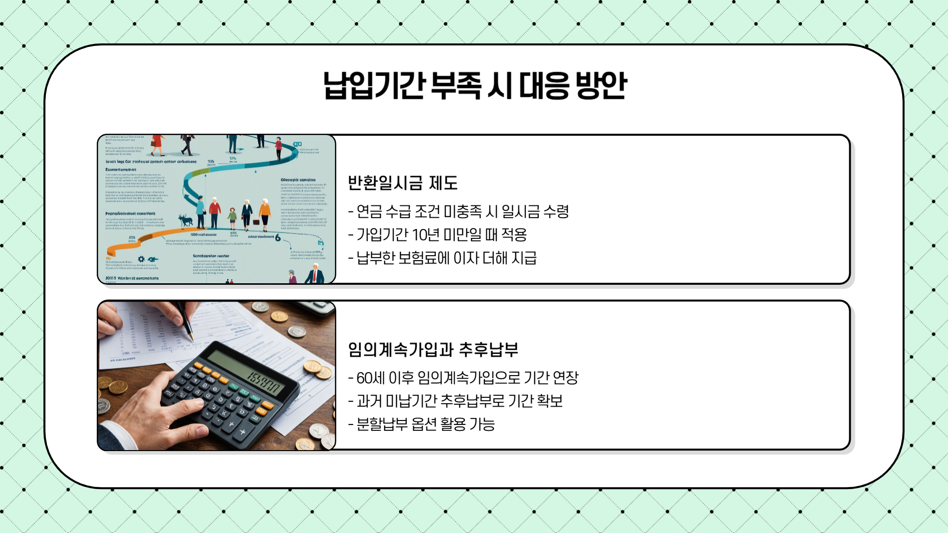 - 추가적으로 납입 가능한 방법: 추납, 반납, 임의계속가입 등 활용 가능