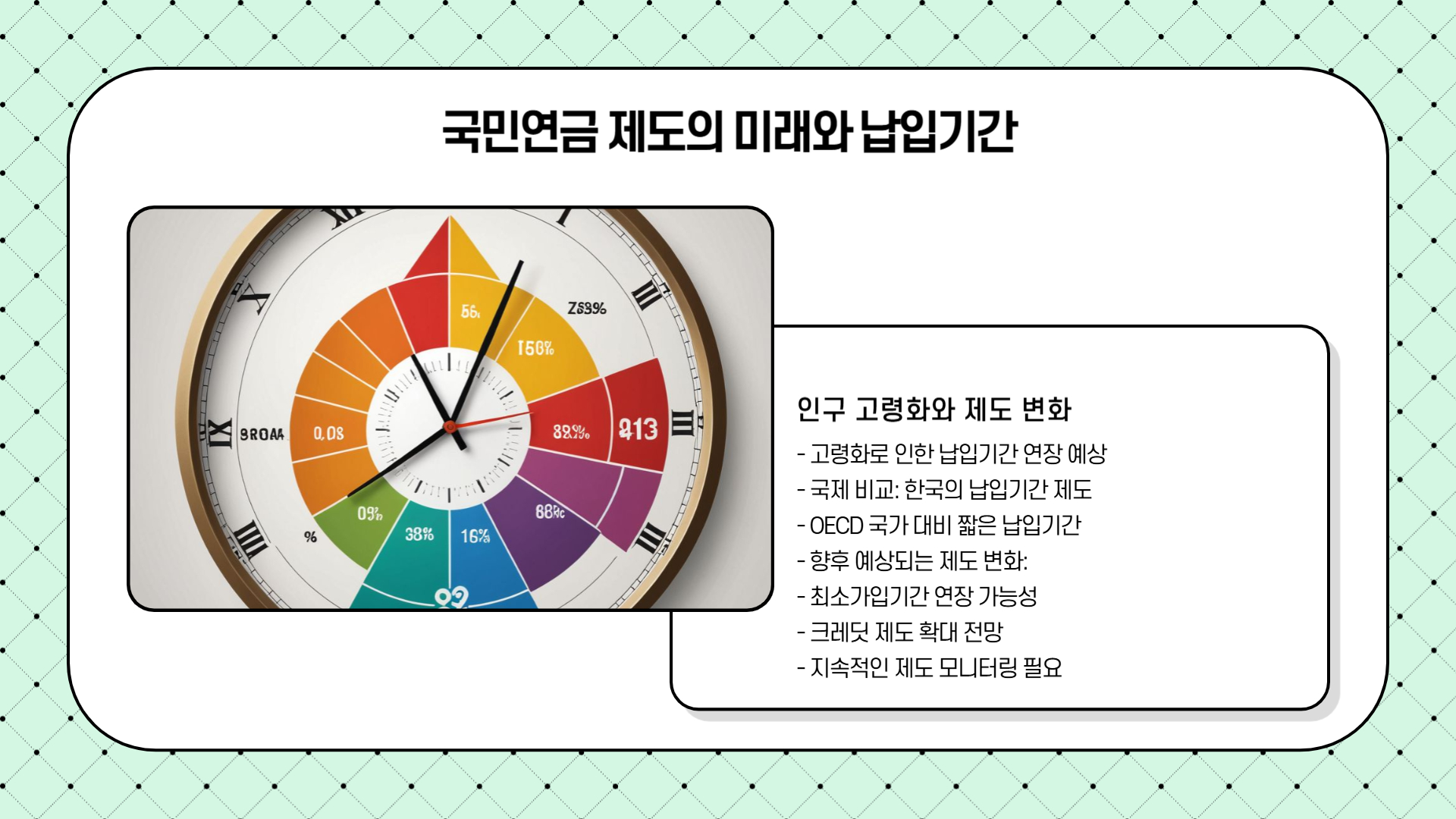 - 최소 가입기간: 10년(120개월) 이상 납부해야 노령연금을 받을 수 있음가입기간이 길수록 연금액 증가 (최대 40년- 까지 인정됨)