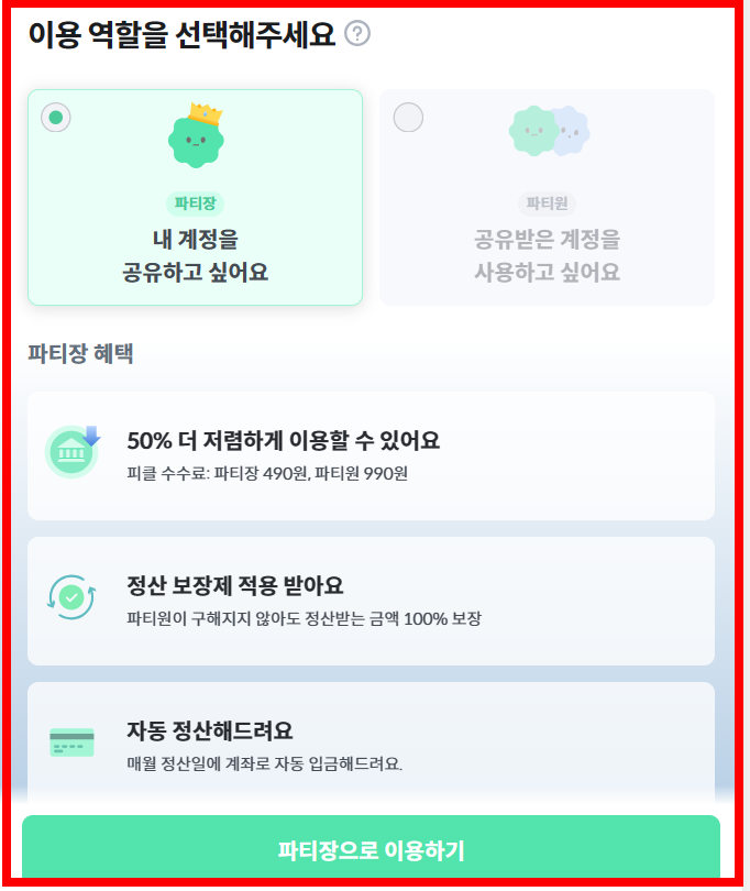 파티장은 피클 플러스 수수료 490원을 내고, 990원을 추가로 내어 각각 파티장은 월 9,490원에 파티원은 월 9,990원에 프리미엄 요금제를 사용할 수 있는 시스템입니다.