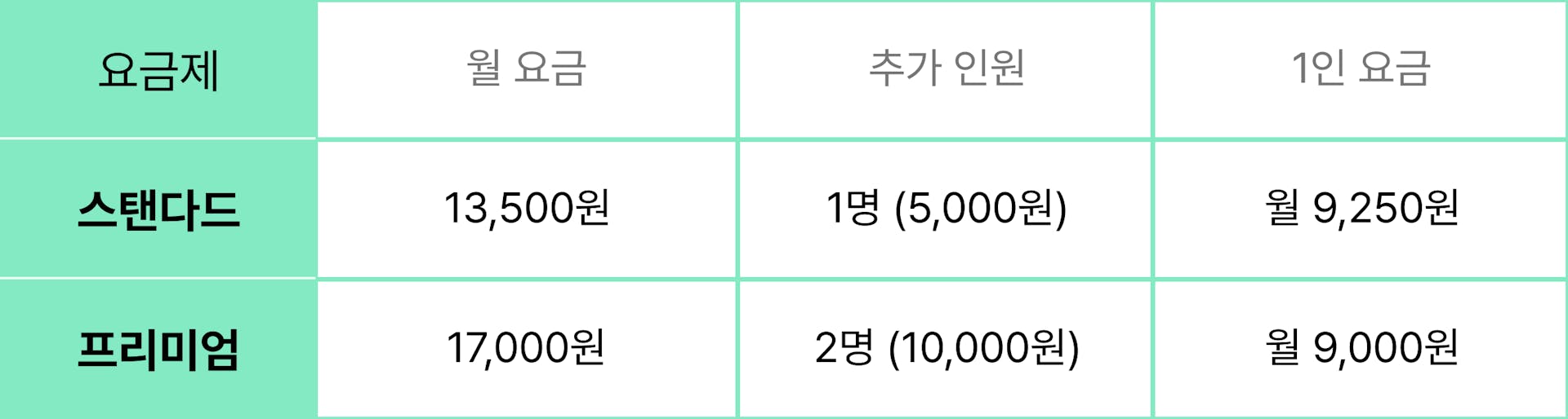 스탠다드 요금제를 두 명이서 계정 공유를 통해 이용 할 경우에는 한 명당 월 9,250원에 볼 수 있네요. 프리미엄 요금제를 세 명이서 계정 공유를 통해 이용 할 경우에는 한 명당 월 9,000원에 볼 수 있어요.